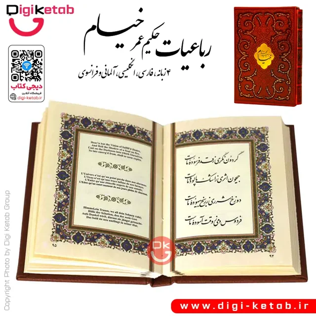 کتاب رباعیات خیام نیشابوری (متن ۴ زبانه) یک نسخه نفیس و فاخر از اشعار جاودانهٔ عمر خیام است که با جلد و قاب کشویی چرمی و به صورت نفیس منتشر شده است. این اثر با ارائه رباعیات به چهار زبان فارسی، انگلیسی، آلمانی و فرانسه پلی میان فرهنگ و ادب شرق و غرب ایجاد کرده و تجربهای منحصربهفرد از خواندن حکمت خیامی در قالبی هنری و بینالمللی به مخاطب میدهد. چاپ و جنس جلد کتاب بهصورت چرمی مصنوعی مرغوب است که حس اصالت و ارزش فرهنگی بالا را منتقل میکند.