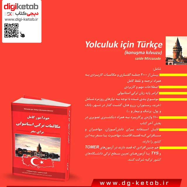 :  کتاب حاضر یک کتاب جامع برای یادگیری زبان ترکی استانبولی می باشد، از نقاط قوت این نسخه میتوان  به مصور ورنگی بودن آن اشاره کرد. با استفاده از این کتاب, هنگام مسافرت به ترکیه نیز میتوانید منظور خود را در موقعیتهای مختلفی که قرار میگیرید به دیگران بفهمانید و از منظور دیگران نیز آگاهی یابید. این کتاب در عین حال, یک ابزار آموزشی برای یادگیری مکالمه زبان ترکی استانبولی است. کتاب با پرسش و پاسخ, شما را با موقعیتهای مختلف و نیازهای زبانی این موقعیتها آشنا میکند. دارای واژه نامه ای برای یافتن سریع واژهها و معانی فارسی آنهاست و در ضمن تلفظ هر کلمه انگلیسی با استفاده از الفبای فارسی در زیر یا در مقابل هر واژه آورده شده است.