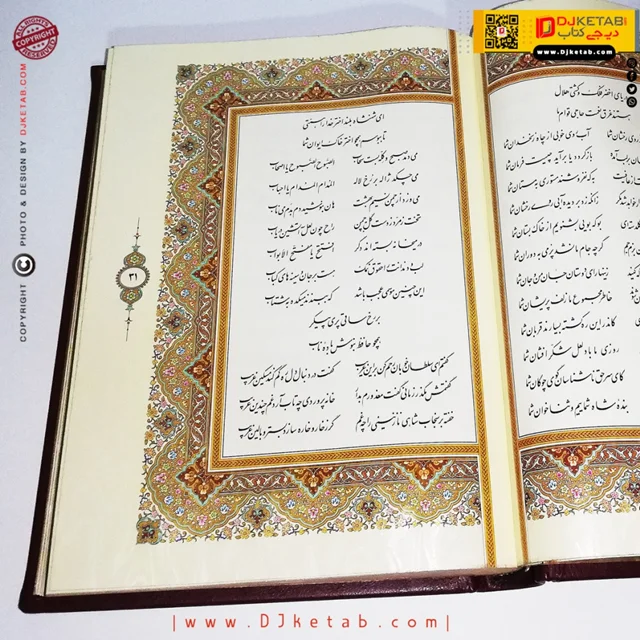 کتاب فال حافظ نفیس چرمی معطر ، کاغذ لیزری ( نقش منبت روی چرم ) ؛ نسخه حاضر به جرات یکی از زیباترین و معدود دیوان های حافظ های نفیس منتشر شده در ایران است که دارای خصوصیات منحصر به فرد است . کتاب و جعبه هر دو روکش چرم ( منقش به منبت روی چرم برجسته ) فالنامه کامل ، تصحیح دکتر غنی و علامه قزوینی به انضمام ترجمه احوال حافظ شیرازی ، حاشیه و تذهیب فوق العاده زیبا کار استاد محمدرضا هنرور ( چاپ پنج رنگ متالیک) تابلوهای خوشنویسی استاد مهدی خدا پناه ، نگارگری : استاد امیر طهماسبی | صفحه چینی :مهدی فیروز خانی ، کاغذ لیزری عطری | چاپ پنج رنگ متالیک و ...