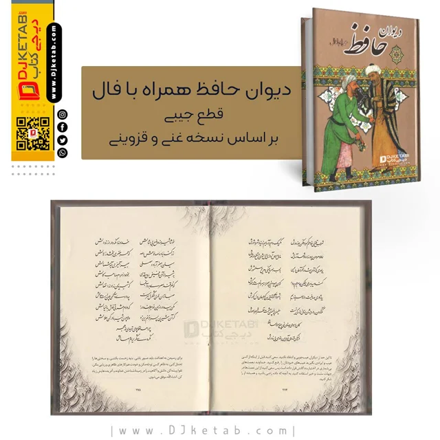 معرفی "دیوان حافظ به همراه فال " قطع جیبی به "تصحیح علامه محمد قزوینی و دکتر قاسم غنی" ؛ این دیوان حافظ تقریبا نفیس شامل تمامی اشعار منتسب به وی است که از او به جای مانده است. این کتاب نخستین بار به طور رسمی در فاصله سال های 1200 تا 1206 هجری قمری چاپ شده است. عمده ترین اشعار حافظ مربوط به غزلیات اوست که در حدود 500 غزل در دیوان او وجود دارد. در مورد مثنوی نیز در برخی نسخ قدیمی دو مثنوی وجود دارد که نشان می دهد حضرت حافظ به منظومه های ویس و رامین، اقبال نامه و شرف نامه نظری داشته است. بخش دیگر هم مربوط به قطعات است که حافظ جهت ثبت رویداد هایی تاریخی سروده است این قطعات بیشتر از منظر تاریخی دارای اهمیت می باشند و بخش آخر نیز مربوط به رباعیات است که بیشتر در نسخ اخیر دیده می شود.