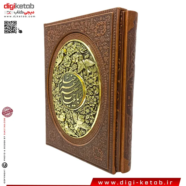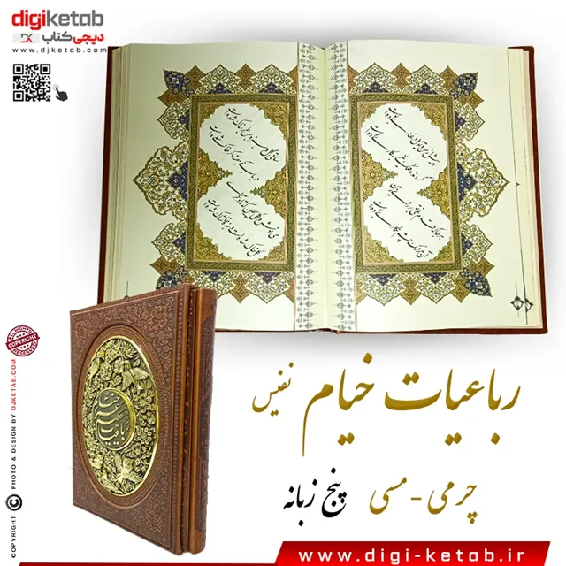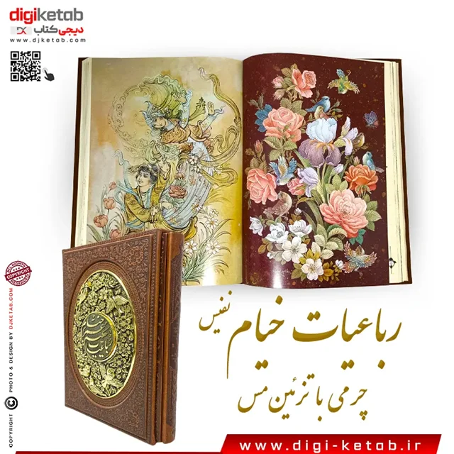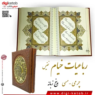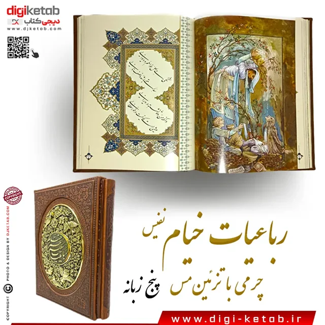 کتاب رباعیات خیام نیشابوری نفیس چرمی ,قطع وزیری با تزئین مس به چهار زبانه فارسی، انگلیسی،فرانسوی و آلمانی به انضمام تصاویر زیبای خوشنویسی و مینیاتوری؛ نسخه حاضر یکی از زیباترین و در عین حال کاملترین نسخه های منتشر شده از رباعیات حکیم عمر خیام است که قاب آن با مس تزئین شده است.این کتاب در عین حال یک آلبوم و کلکسیون نقاشی های مینیاتوری و خطاطی هست که از ابتدا تا انتهای آن توسط اساتیدی همچون همچون استاد رضا ظرفیان، استاد رضا بدرالسماء و استاد هنرور خطاطی و نگارگری شده است که تلفیق هنر و ادبیات ایرانی را در کنار یگدیگر نشان میدهند.کتاب حاضر بر اساس تصحیح محمد علی فروغی بامقدمه علی اکبر دهخدا در حدود 290 صفحه با کاغذ بسیار مرغوب و ضخیم گلاسه به صورت تمام رنگی با صحافی دوختی و جلد زرکوب ارائه شده است.در انتهای کتاب نیز در حدود 135 صفحه ترجمه های انگلیسی،فرانسوی و آلمانی جای گرفته است. اکنون می توانید این کتاب فوق العاده را با تخفیف استثنایی از دیجی کتاب خرید نمایید